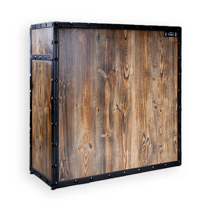 Caisse en bois contreplaqué finition stratifié, contour métal riveté.