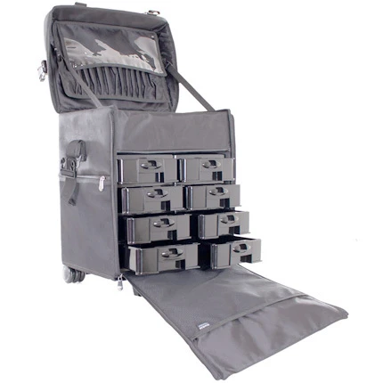 La valise est équipée de 8 tiroirs de rangements pour y glisser vos petits produits comme les crayons, les rouges à lÚvres ou encore les ombres à paupiÚres. Sur le haut de la v