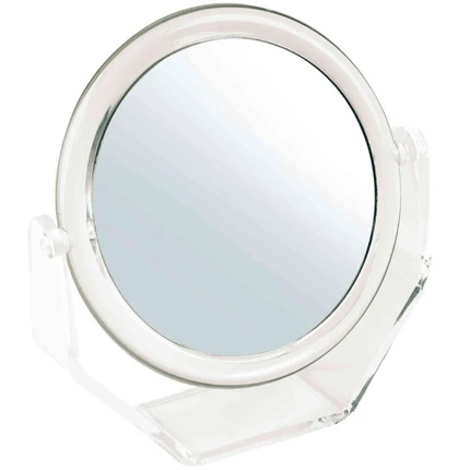 Miroir rond diamètre 21 cm avec support Plexi à poser. Double face: 1 face miroir traditionnelle, 1 face grossissante X5. Hauteur : 22cm