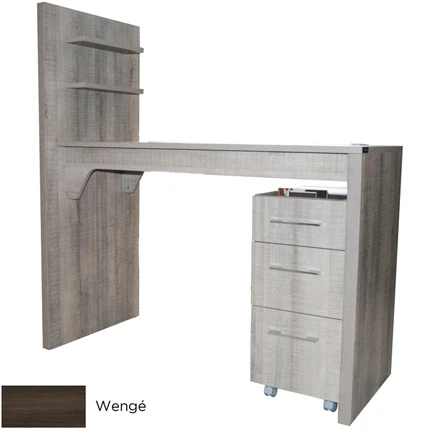 Table manucure en bois avec aspirateur, deux étagères sur le côté et un caisson 3 tiroirs sur roulettes amovible.