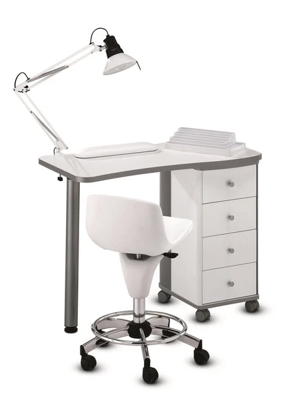 Table Manucure en bois, Blanche, un côté bloc 4 tiroirs avec roulettes, un côté tube Alu.