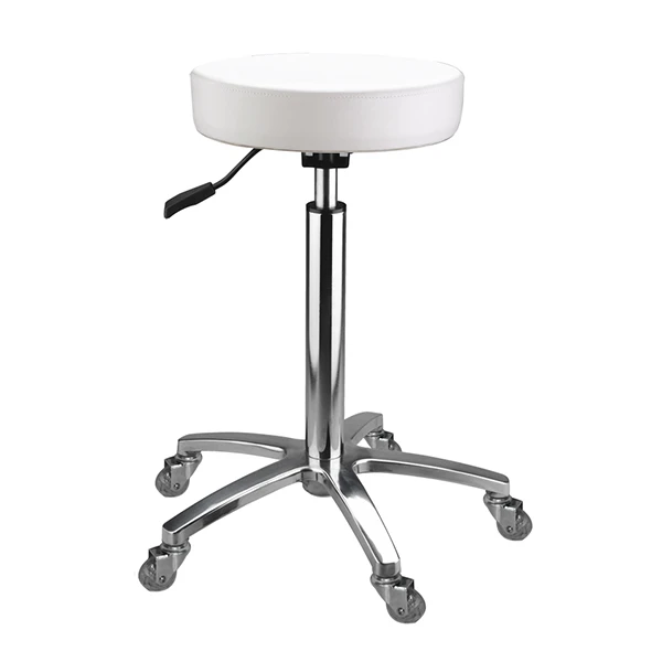 Tabouret blanc avec pompe à gaz, galette épaisse de 7cm. Pied chromé en étoile 5 branches avec roulettes Skate.
