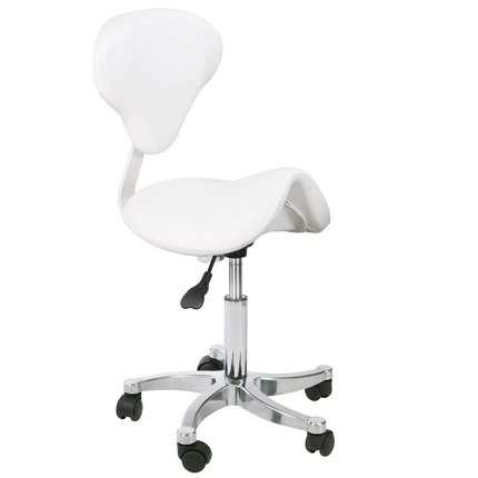 Tabouret ergonomique anti-fatigue avec dossier blanc ultra confort, idéal pour un maintien parfait du dos. Pied chromé 5 branches avec roulettes Skate silencieuses.